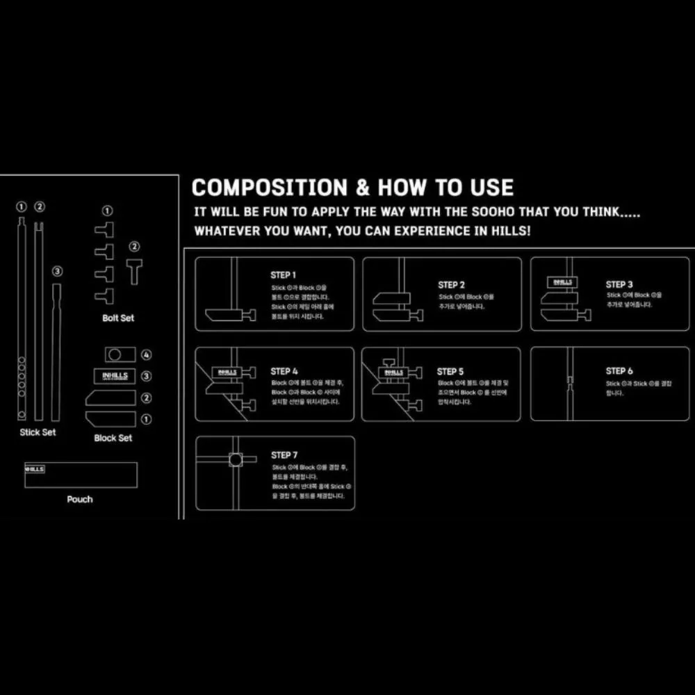 Components: 3 bars, 4 blocks, 5 bolts, bag, instruction manual
